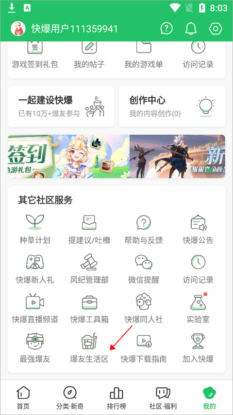 2、也能够进入【我的】页面,然后点击【爆友生活区】