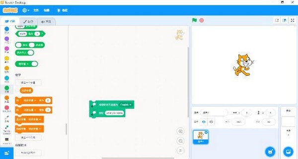 模块分类与指令集合都放在了左侧,脚本区在屏幕的中央,而舞台与角色区则移到了屏幕右侧