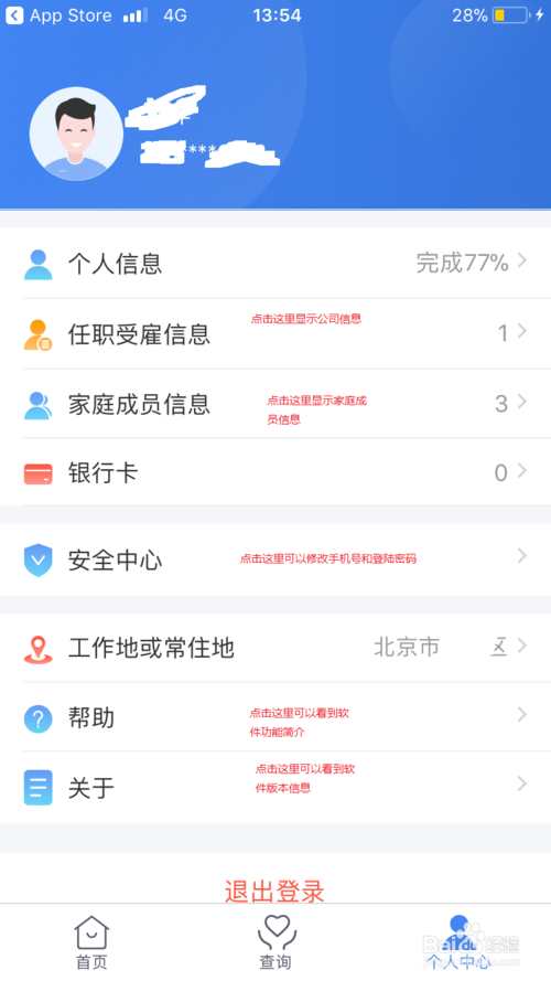4、点击个人中心图标,进入个人中心页面。在此页面中功能项目较多,有个人基本信息,任职受雇信息既你所在公司的信息,家庭成员信息(可以提前录入,方便填报),帮助里面显示的是app的基本功能项目,关于可以看到当前个人所得税app的版本信息