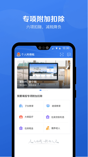 个人所得税app是国家税务总局推出的官方税收管理、个税申报系统手机应用。通过实名注册后,就能进行专项附加扣除信息的填报。纳税人通过人脸识别,再注册个人身份证号与手机、地址等信息,就能实时查询自己可享受的税收优惠。个人所得税app是最新版的自然人税收管理系统客户端。个人所得税app国税业务功能包括:自然人实名认证、自然人信息采集、自然人信息变更及找回密码等用户管理配套功能。登录宁夏网上税务局,进入“个人所得税扣缴”页面,扫描该页面二维码(用于“个人所得税APP”下载)!本平台可实现实名注册、用户登录、个人信息维护、任职与投资信息采集、安全中心五大基础功能,2019年1月1日后,您可以通过本平台报送专项附加扣除信息、在线填写申报表、在线缴税,并实现完税证明的在线开具等业务。