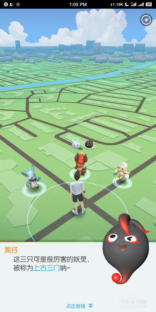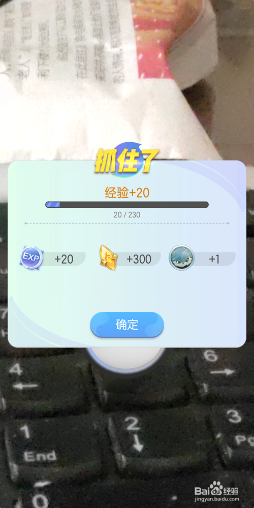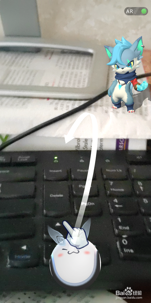 3、这个时候,我们就可以看到这只萌萌哒的小妖精出现在了我们手机屏幕上,同时它所处的环境也是我们摄像头对准的地方,是不是很有一种身临其境的感觉。我们按照图上的轨迹,用食指滑出轨迹,抛出封印球。