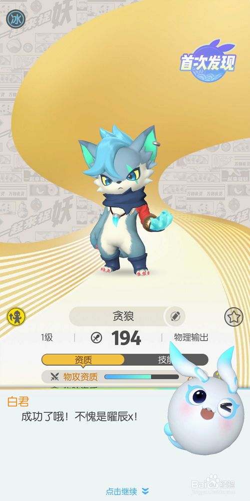 5、之后,我们可以在这个界面具体查看捕获成功的妖精的详细数据,比如是否首次发现,它的各项能力值等等。