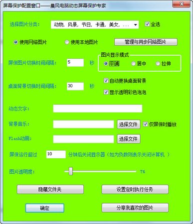 电脑动态屏保软件是一款支持各种图片格式,尤其是动画gif、png、jpg等格式的超强动态屏幕保护程序,支持设置屏保密码、隐藏特定文件夹,定时关机,定时执行特定任务等功能。这样当你偶尔离开电脑时可以防止有人无意中偷窥你的电脑。有了这款软件后,无论是你电脑的安全性还是美观性都能大大加强。