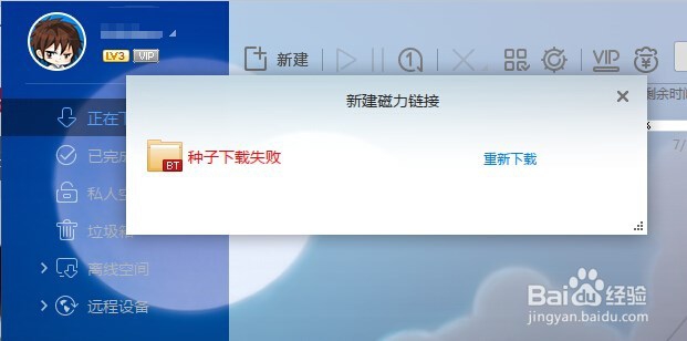 再次尝试下载对应的Bt或磁力链接。如果仍然下载失败,则直接关闭此提示窗口,同时点击“新建任务”按钮,从打开的“新建任务”窗口中将“磁力链接”进行复制。