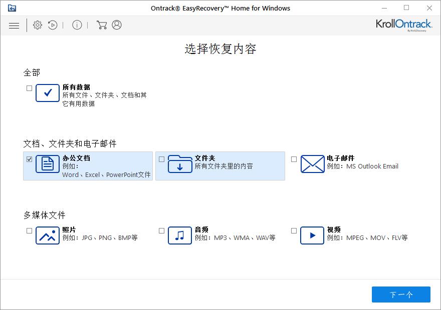 步骤一:选择恢复内容。打开已经安装好的数据恢复软件 EasyRecovery 12 ,进入第一个操作界面,我们可以看到这里要选择恢复内容,这里我们选择恢复“办公文档”,点击右下角的“下一个”。