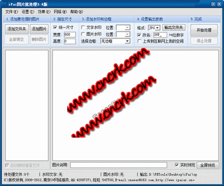 iPai图片批处理是一款旨在简化图片批量处理过程、大大减少工作量的免费软件。支持图片批量缩放、批量转格式、批量改名、批量加水印、批量加边框、批量特效、批量上传等,兼备摄像头拍照、屏幕截图、图片浏览、数码照片校正、图片编辑等功能。