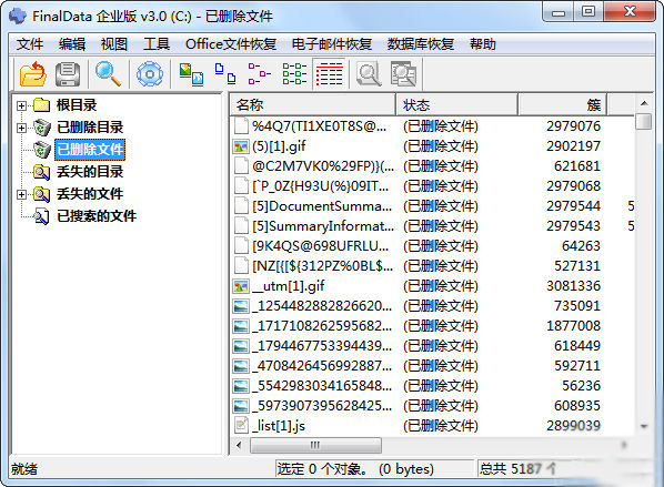 Final Data数据恢复软件在完成所有的检查后会将目标任务驱动器的所有文件分类后以表格形式详细列出来,包括正常的目录、已删除的目录和删除的文件等大类。在表格右边的详细列表中列明了所有的文件资料,包括文件的名称、大小、目前状态(是否破损)和创建时间,最关键是文件所在的物理簇位置,这样恢复这个文件就不是什么问题了!