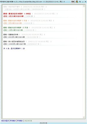 倒计时软件,用户设置目标日期与事件,程序提示该日期事件距当前时间的天、时、分和秒。支持无数条日期事件设置。如用户希望设置农历日期事件,程序内置“万年历”工具供用户进行农历/公历转换。