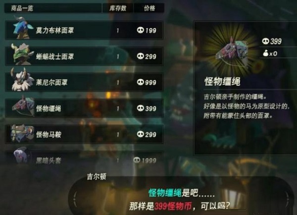 怪物马具是需要在怪物商人吉尔顿处购买,不过一开始玩家是找不到他的,需要先在东阿卡莱驿站的霍司塔处接任务,然后他才会出现骷髅池塘。第一次对话没法购物,但是他会告诉你他可能出现的地点,之后在那些地点都能随机遇到他,到时候就可以购买了(需要用材料兑换怪物币,用怪物币来购物)。