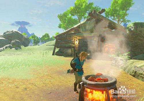 4、在各种营地、怪物聚集部落都会有一口锅,可以借来用用。在道具菜单中选择食材,选择“拿在手中”(Hold),一次最多拿5个素材,跑到锅边扔进去,咣当咣当一阵就做完了。