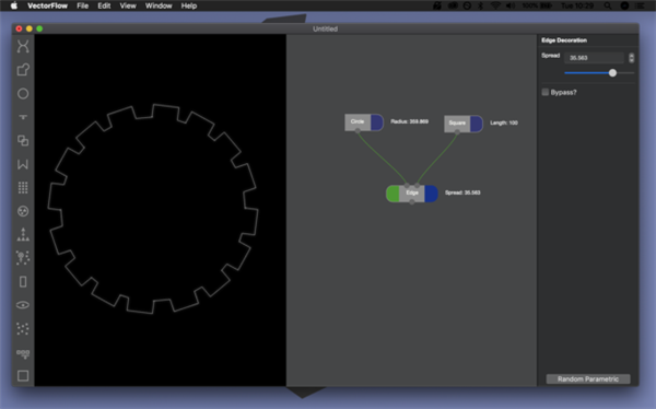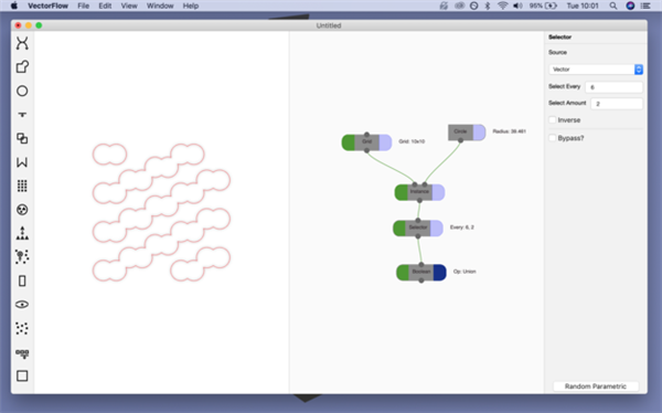 VectorFlow Mac版将节点连接在一起创建矢量流以生成新形状,将这些节点与其他图形组合在一起可以轻松创建复杂形状。交流发电机,作为输入在矢量形状之间切换,标准布尔运算