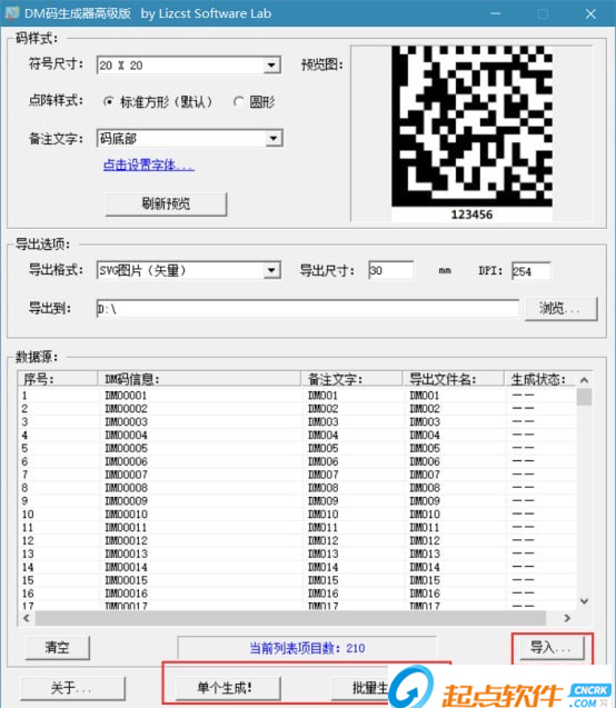 4、设置好前面的参数便可以开始生成码图像了,这里可以单一生成单个码图像也可以导入Excel表格批量生成码图像。