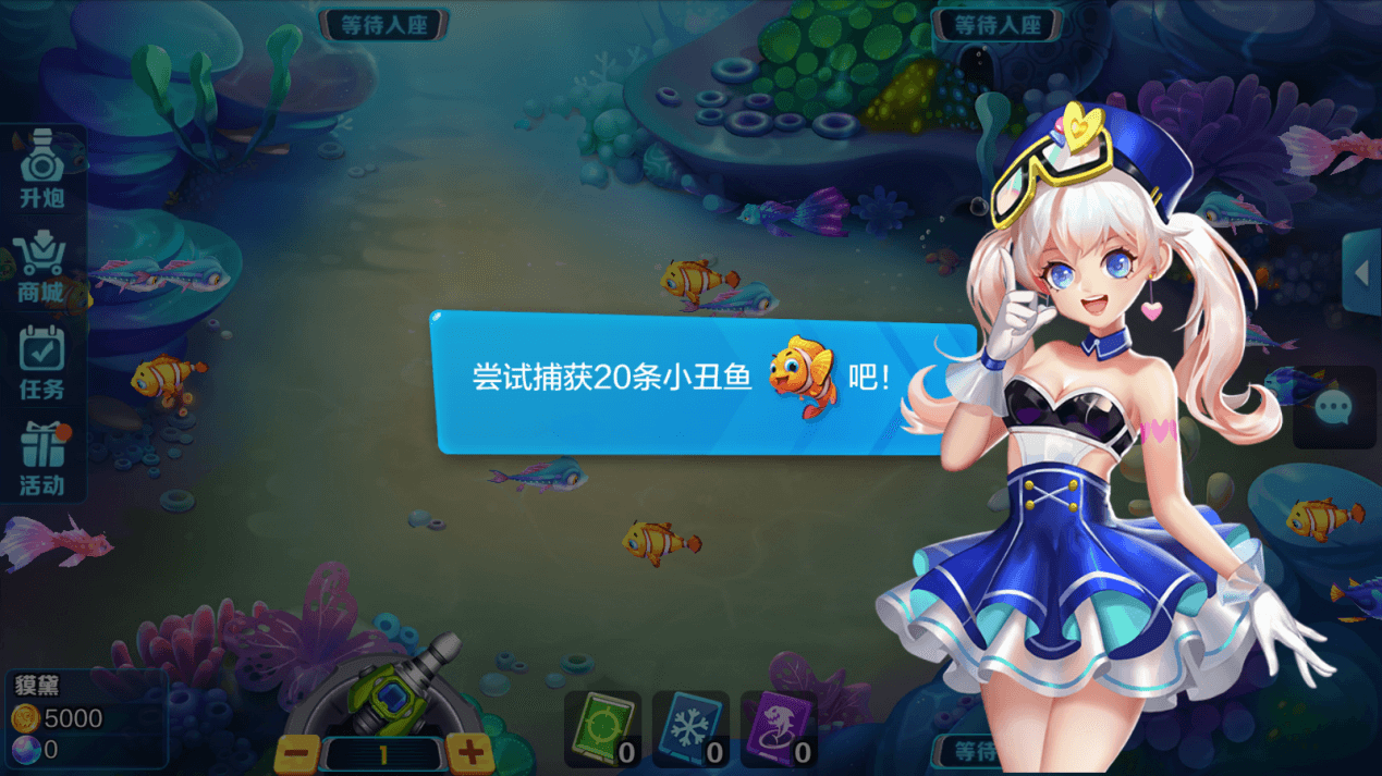 第一个新手任务就此开始,大家需要用一倍炮尝试捕获20条小丑鱼。小丑鱼的形象已经在水手姐姐的对话框中有提示。
