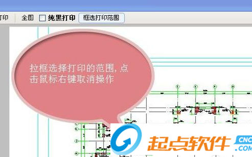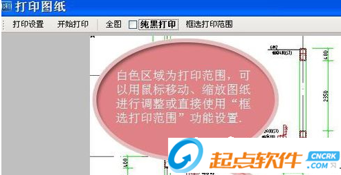 2、点击打印后,在弹出的打印图纸界面中,白色区域为打印范围,可以用鼠标移动、缩放图纸进行调整或直接使用“框选打印范围”功能设置。