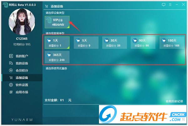 3、点击“添加设备”,进入如下界面,选择设备类型和套餐类型,选择底部支付方式完成支付即可成功添加新设备。