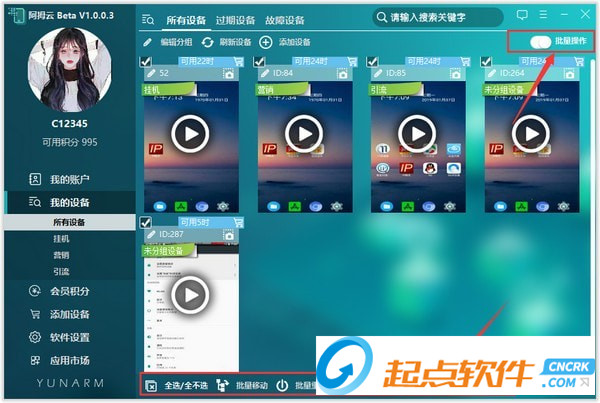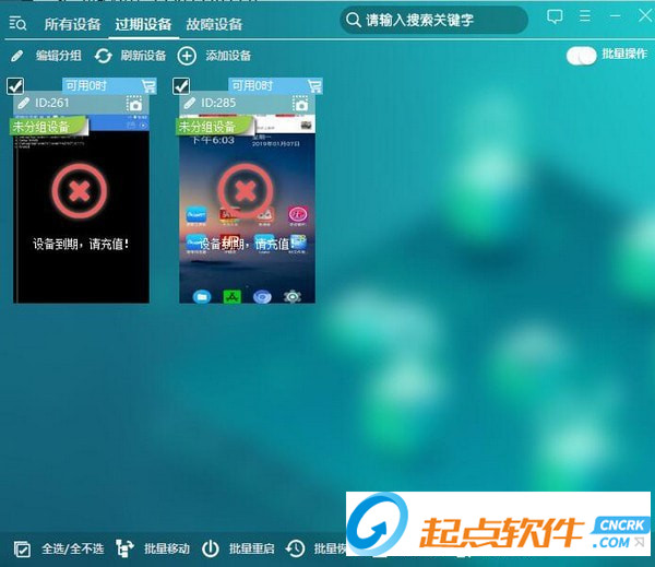 4、工具栏右侧“批量操作”功能:打开此功能单个设备左角会出现复选框,单个设备界面上的工具栏会消失,界面底部会出现批量操作工具栏,可多选设备进行批量操作。
