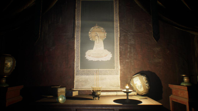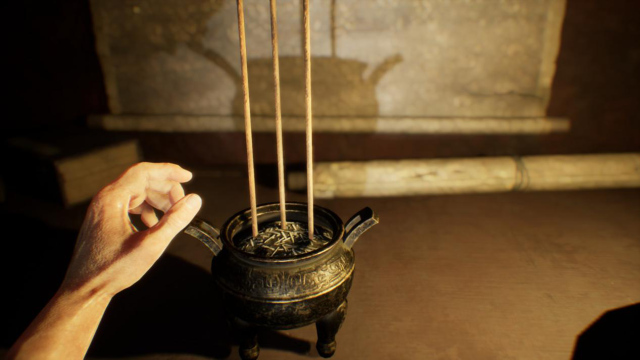 游戏的存档系统也别出心裁,玩家在初步探索后会找到一个安全屋,而这座安全屋为何可以在这座怨鬼阴魂不散的古宅中守一方清净呢?因为这里供奉着菩萨,当玩家第一次进入时,旁白会告诉你“这间房间似乎受到了神灵的庇护,不会受到鬼怪的侵袭”。这间安全屋会成为往后游戏过程中最安全的避难所,而如何存档?就是拿起一根香并点燃献给菩萨。