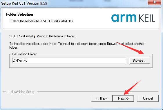 3、定义Keil C51软件安装路径,默认是安装在C盘目录下的,可点击browse浏览选择一个合适的非系统盘安装位置。点击next.