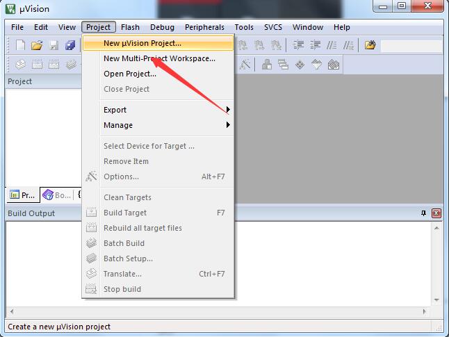 2、进入主界面后点击project再选择new uVision Project创建新工程。