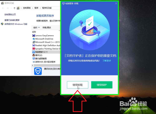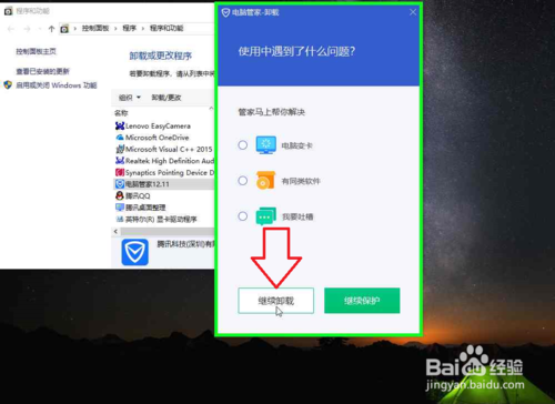 6、在"电脑管家 卸载 (窗格)"上左键单击:"继续卸载(按钮)",(在"电脑管家 卸载 "中)。