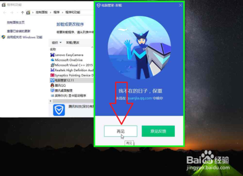12、在"电脑管家 卸载 (窗格)"上左键单击:"再见(按钮)",(在"电脑管家 卸载 "中)。