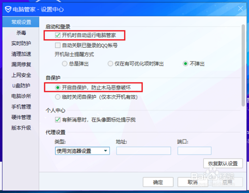4、将开机时自动运行电脑管家”项取消勾选,自保护也可以关闭掉,点击确定就设置完成了,如下图所示: