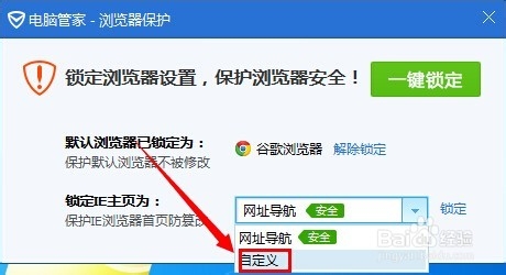 3、在电脑管家“浏览器保护”设置界面,可以看到主页设置处。下拉菜单选择“自定义”。