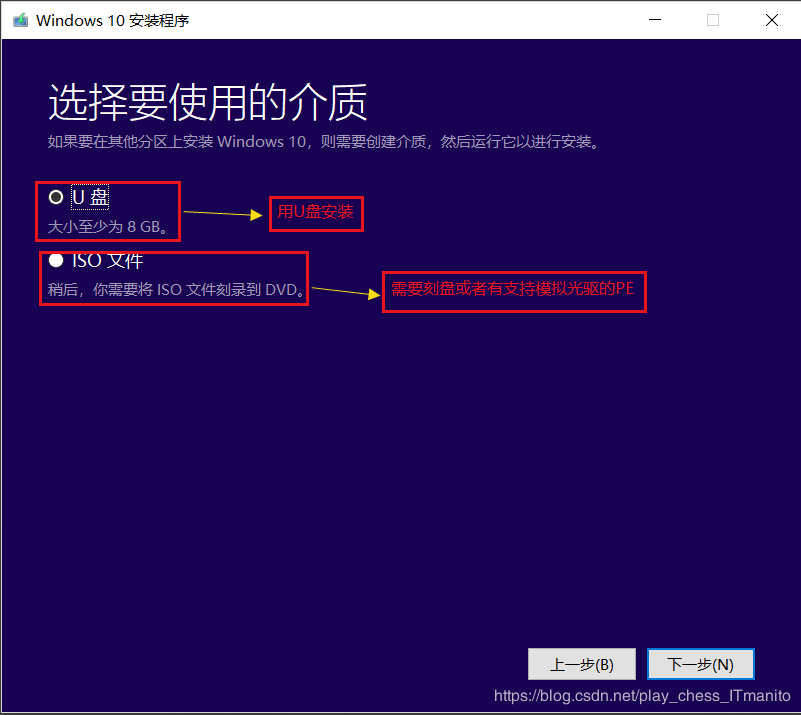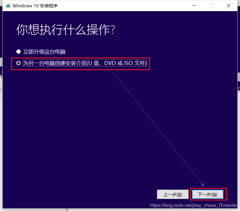 第一项是在线升级不用管,选择第二项为另一台电脑创建安装介质(一定要选第二项,第一项是直接升级,只会下载升级包)