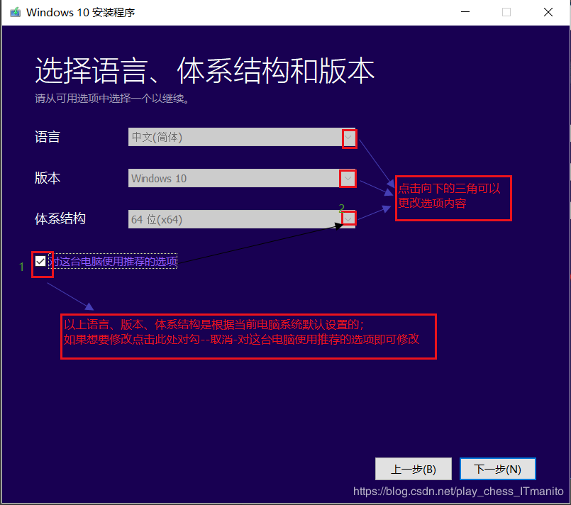 设置下载系统的语言,版本,体系结构(32位或64位),系统会根据你当前系统默认;如果你想更改取消下方选项 对这台电脑进行推荐设置选项即可更改