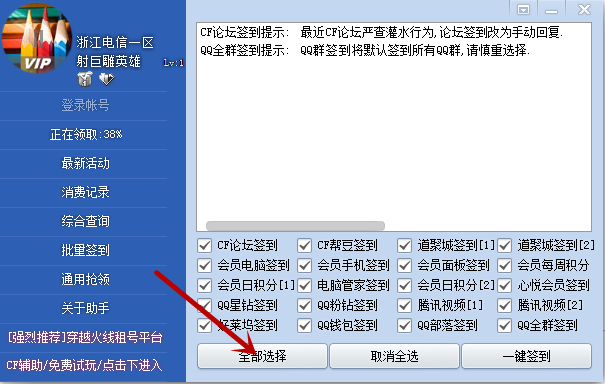 CF聚豆、CF帮豆、CF论坛、QQ会员、QQ钱包、QQ群等多种功能一键签到。