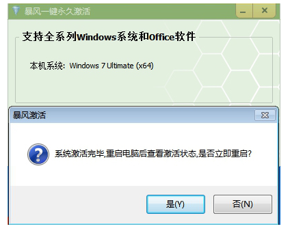 5、大约一分钟我们系统便成功的激活完成啦,此时程序提示我们进行重启电脑,点击否