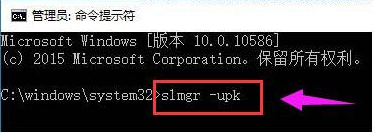 2.在打开的命令符号符界面中输入:slmgr -upk命令来卸载原来windows10系统中存在的激活密钥。