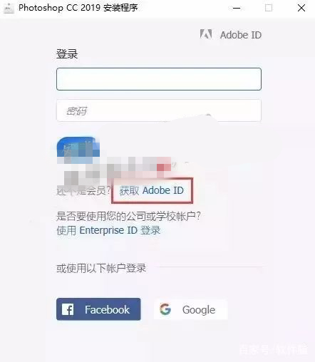4. 首次安装的时候我们需要注册一个账号,点击【获取Adobe ID】;已经有账号的用户可以直接登陆。