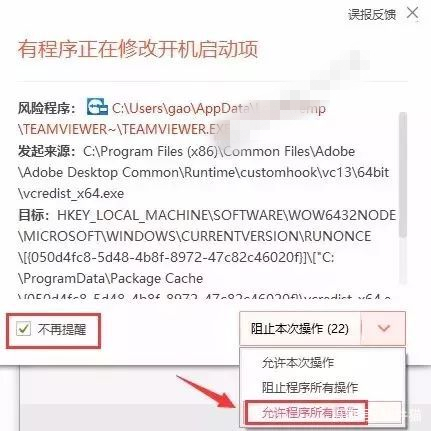 8.若杀毒软件弹出如下提示框,先勾选【不再提醒】后再点击【允许程序所有操作】。