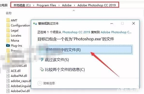 6、将提供的破解补丁粘贴到上一步打开的文件目录下替换原文件(注意:如果拖进去没有出现提示替换的请先复制再到安装目录下粘贴)