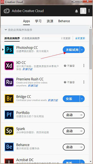 4、安装完成后点击试用启动软件,启动后关闭软件并把安装的Adobe Creative Cloud卸载
