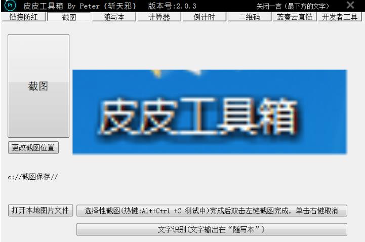 皮皮工具箱(PiPi_ToolBox)拥有众多实用功能,包括链接防红、截图(含自定义截图)、随写本(含百度翻译,百度文字识别)、计算器、时钟(倒计时功能)、二维码(离线)、蓝奏云直链(无密码分享缩短功能不稳定)