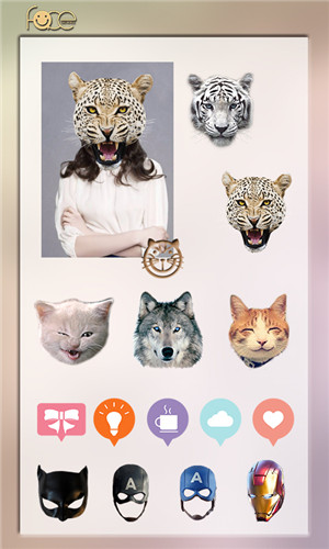 1、我们提供了10余种动物脸供你选择,包括老虎、狮子、猩猩、猫、猫头鹰等,并将持续更新。2、提供4种换脸方式,你可以选择将脸的上半部分、下半部分、左半部分和右半部分,换成动物的脸,形成多种奇异的效果。