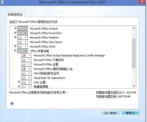 2、然后再次安装的时候,选择“自定义安装”中的“office 共享功能”,将"business connectivity services"设置为不可用,点击“继续”。