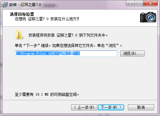 二、进入到证照之星免费版安装位置选择界面,如下图所示,你选择默认安装,那么软件会安装到系统C盘中,如果你想自定义安装,那么点击浏览就可以选择合适的安装位置,完成后再点击下一步。小编建议你选择自定义安装。