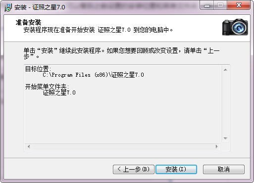 三、进入到证照之星证照之星准备安装界面,如下图所示我们可以看到之前设置的安装位置和菜单文件夹,确认无误后我们点击安装就可以开始安装了。