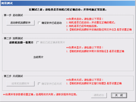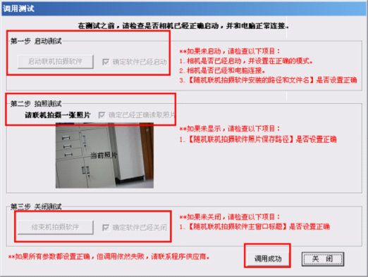 3. 关闭测试,我们选择关闭测试按钮,联机拍摄程序关闭,后面的确认软件已经关闭,也打上勾,至此调用测试已经全部完成了。会显示调用成功按钮。