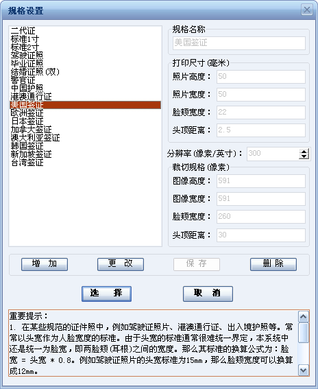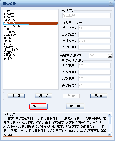 点击工具栏中“规格设置 ”工具按钮,弹出“规格设置”对话框,选择毕业证照,在对话框的右边将会出现标准的毕业证照打印尺寸、分辨率和裁切规格,点击“选择”按钮。
