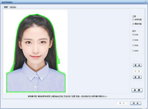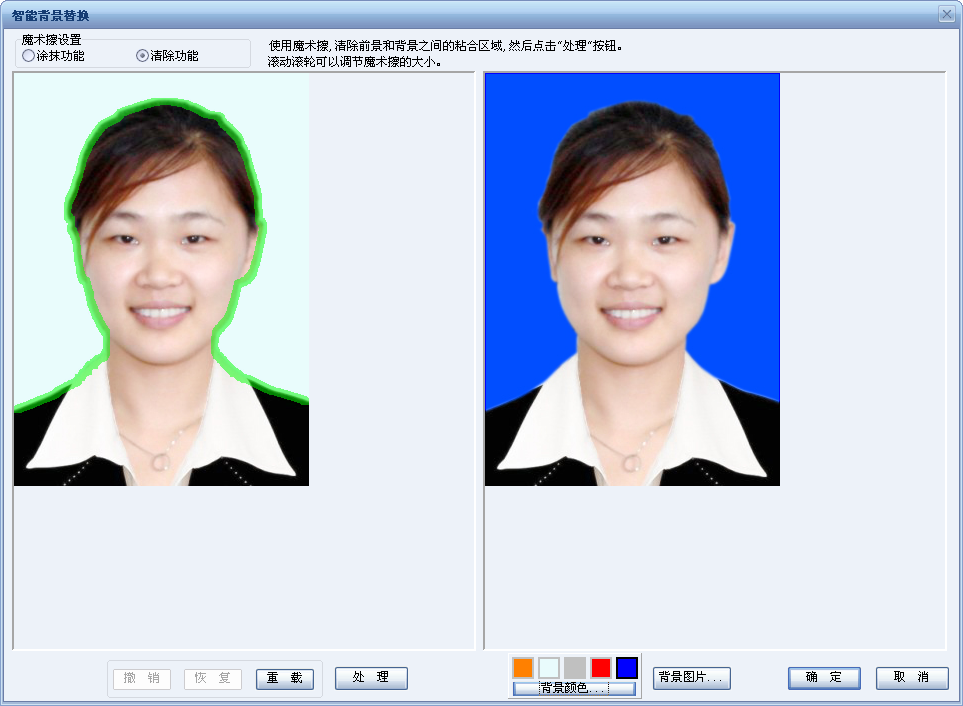 3、点击“背景处理”,在出现的“智能背景替换”中使用魔术擦,清楚前进和背景之间的粘合区域,然后点击处理。