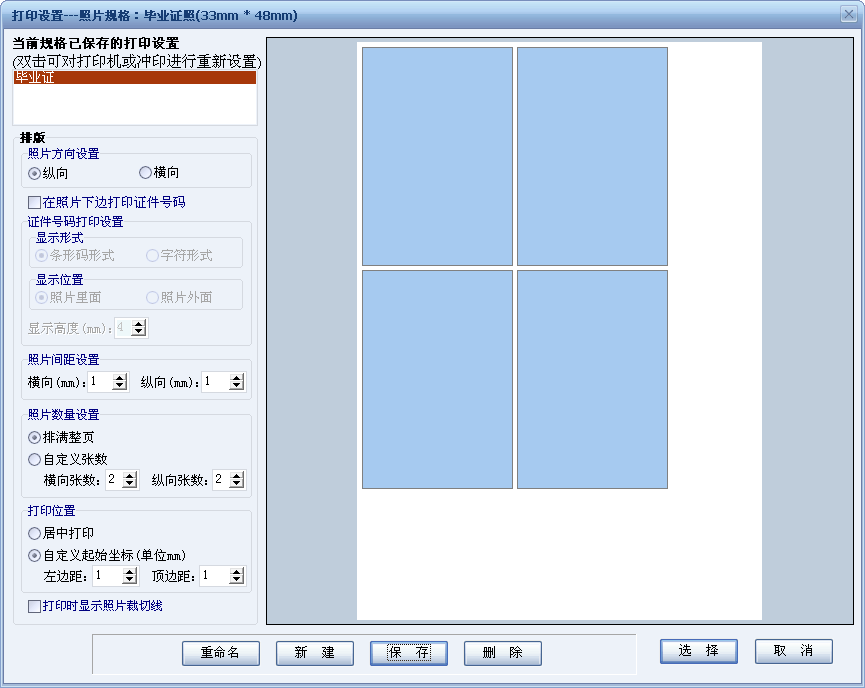 点击工具栏上“打印设置”工具按钮,打开“打印设置-照片规格:毕业证照”对话框。点击“新建”按钮,如果本机连接有打印机选择“本地打印,”否则选择“送至冲印”,在这里选择“送至冲印”,选择纸张名称,点击“确定”。然后按照自己的需求设置排版,点击“保存”,输入保存名称,点击“选择”。