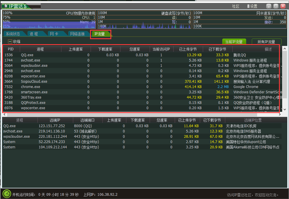ip雷达是一款非常实用的电脑流量监控工具。ip雷达可以帮助用户实时监控电脑网络流量使用状态,为用户实时显示电脑上网流量,数据涵盖详细到电脑每个远程ip流量及流量排名,是用户不可缺少的pc流量监控工具。