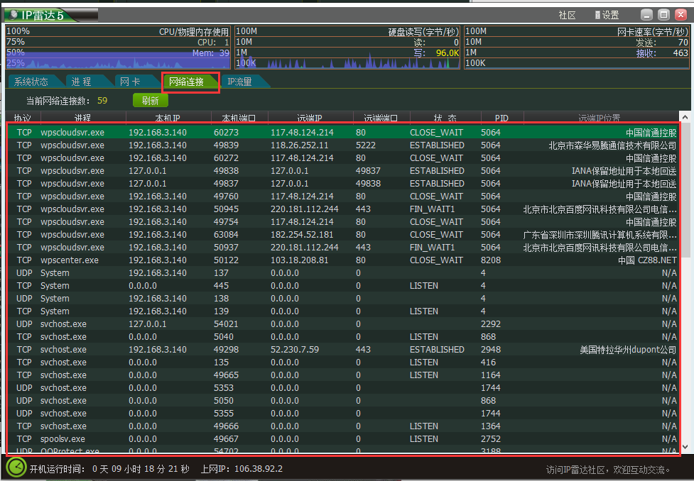 这里显示了网络连接的程序名称、IP地址和端口,以及对方的IP地址和端口等讯息,很实用。