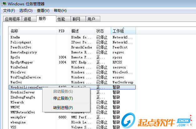 8、安装完成后先不要运行软件,打开任务管理器,点服务,找到HoudiniLicenseServer,右键点停止