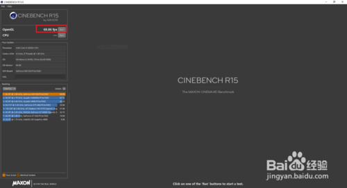 至此,Cinebench R15所得到的OpenGL和CPU的值,即为测试结果;