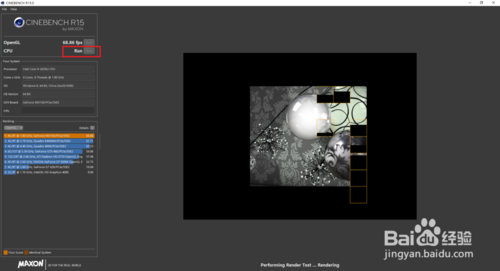 可以看到,在点击了run 后软件就开始了渲染测试了。然后耐心等待跑分的结果就ok了。